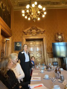 Eine Gruppe von Personen im Rathaus im Gespräch mit Hamburgs Erstem Bürgermeister Peter Tschentscher, es spricht Ursula Richter-Schneider vom ZONTA Club Hamburg-Elbufer